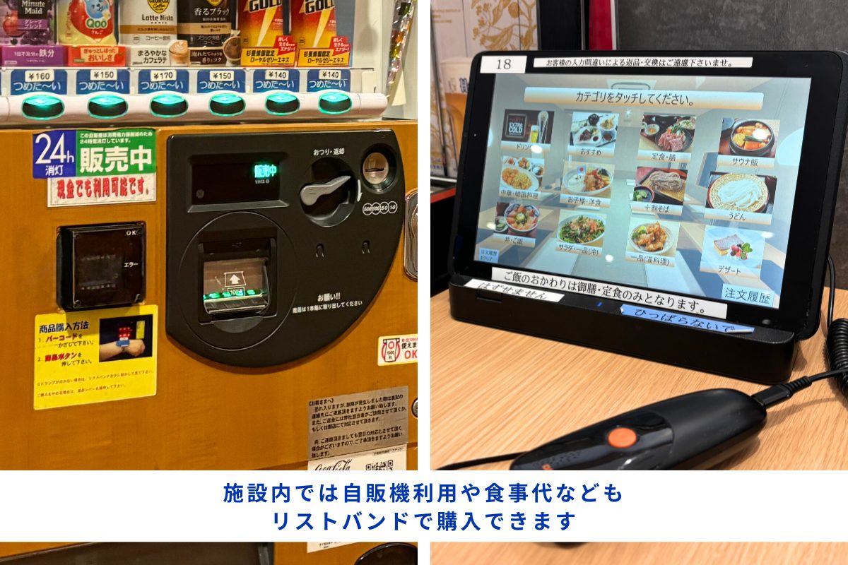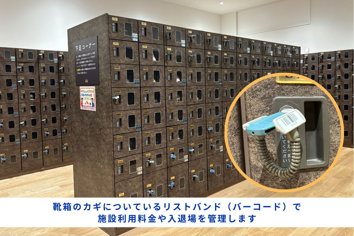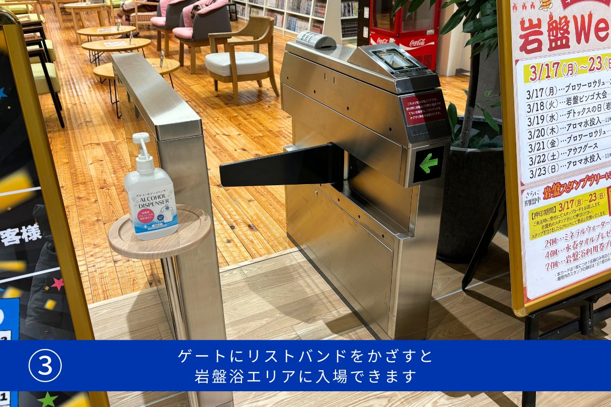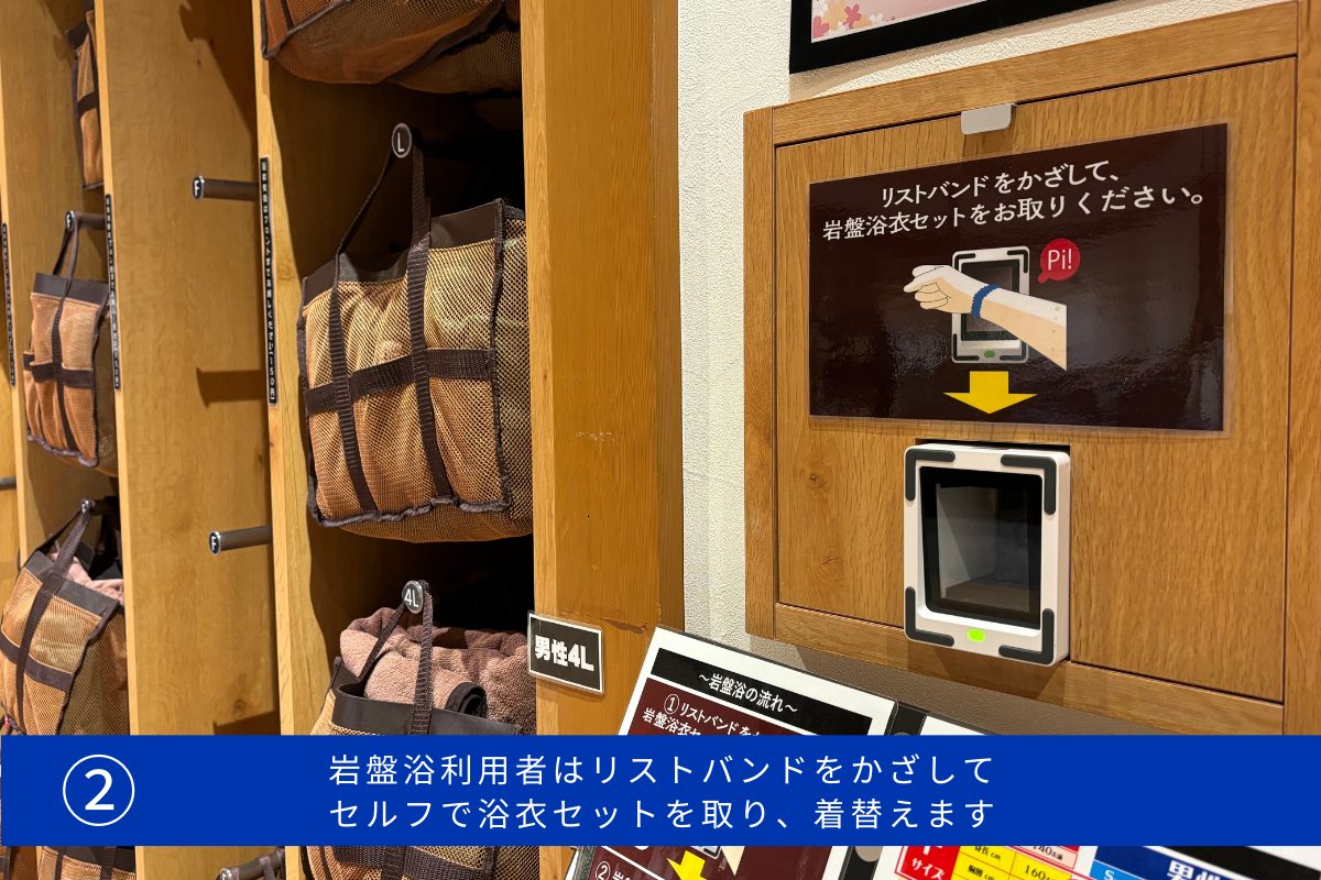 岩盤浴利用の有無は、施設入口の受付システムに靴箱のカギにつけているリストバンド(バーコード)をかざし初めにお選びいただきます(岩盤浴は入浴と別料金)。岩盤浴利用者は、岩盤浴エリアの入口にあるゲートにリストバンドをかざすことで、入場することができます。