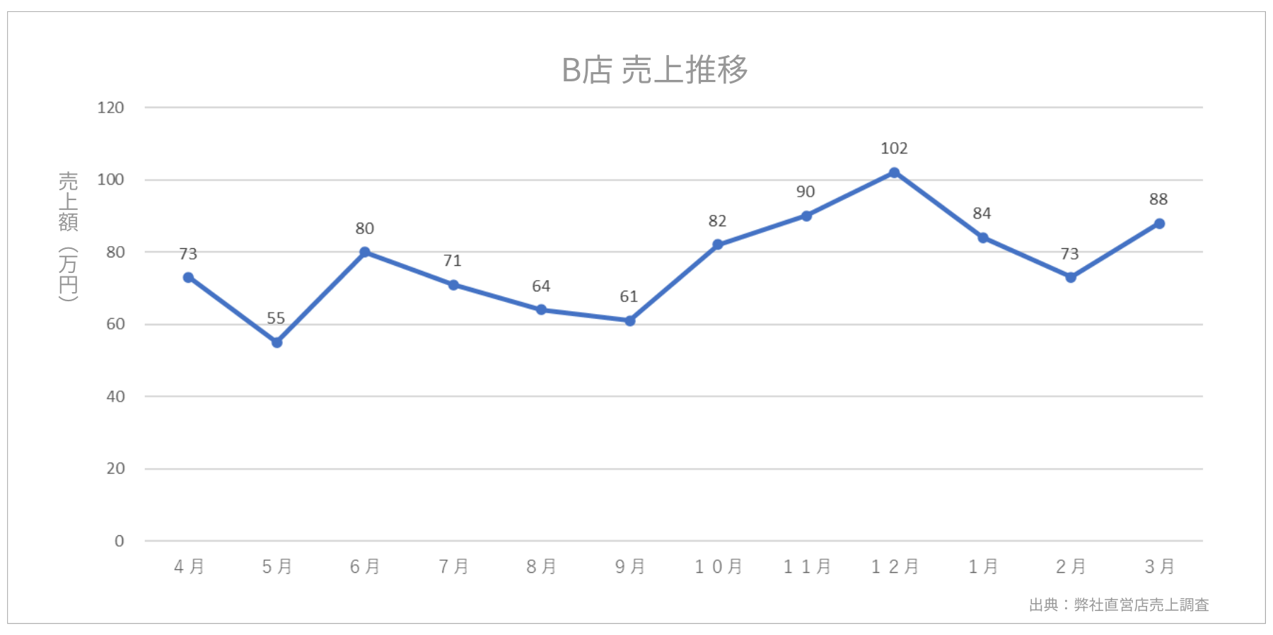 売上の変動は、先述したように12月がピークになっています。この年のB店は、衣替えのシーズンの秋から12月にかけて右肩上がりで売上を伸ばし、1・2月も比較的高い水準を保っています。