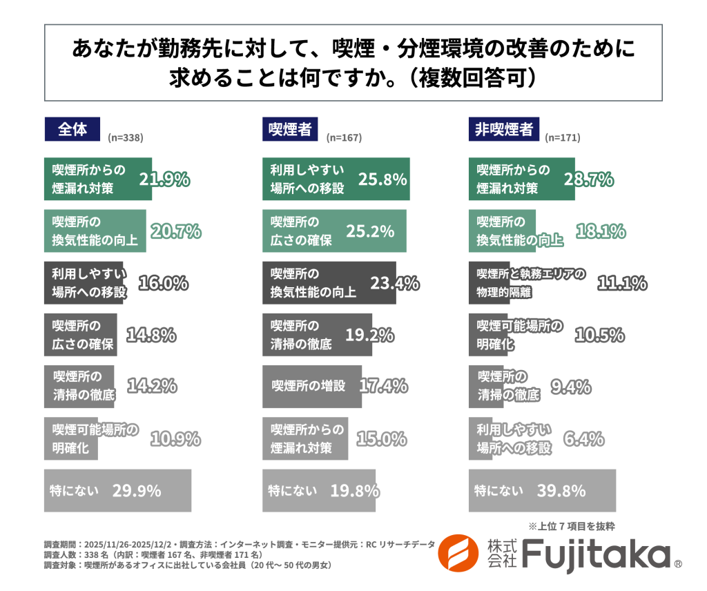 今回の調査を通じて、オフィスに出勤している会社員の3人に1人がオフィスの喫煙環境に不満を感じていること、また「喫煙スペースの使いやすさ」「臭い問題」に対し、特に改善を求めていることが明らかになりました。