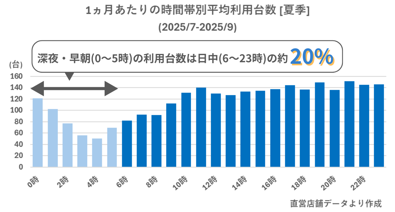 次のグラフは夏季における時間帯別の利用台数を表しています。直営店舗のデータでは、深夜・早朝(0~5時)の利用台数は日中の利用台数の約20%となりました。つまりこの例においては、24時間体制で営業することで夜間休業の場合に比べ、1.2倍のユーザーを獲得しています。