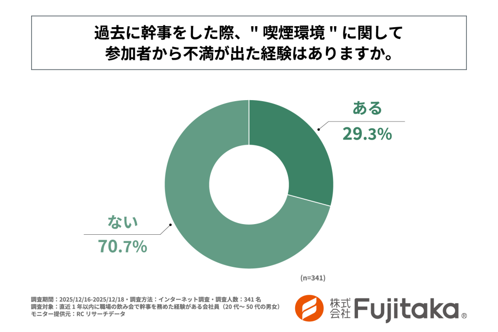 すると、幹事経験者の約3割(29.3%)が、過去に「喫煙環境に関して参加者から不満が出た経験がある」と回答しています。