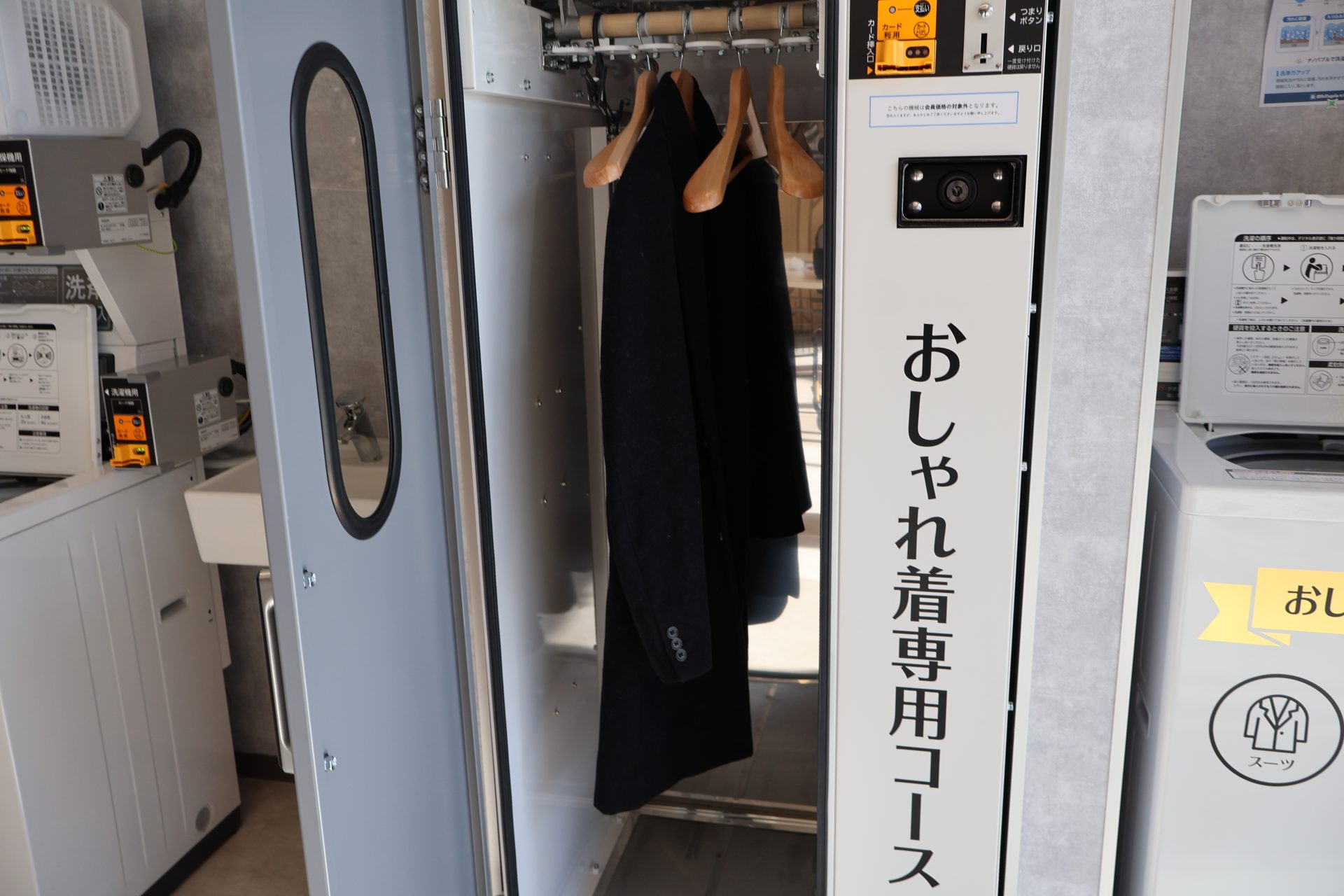 ホワイトピア梅津段町店に入ってすぐ目に入った「おしゃれ着専用コース」!コートやスーツ、セーターなどのおしゃれ着を洗ってくれる最新機器です。