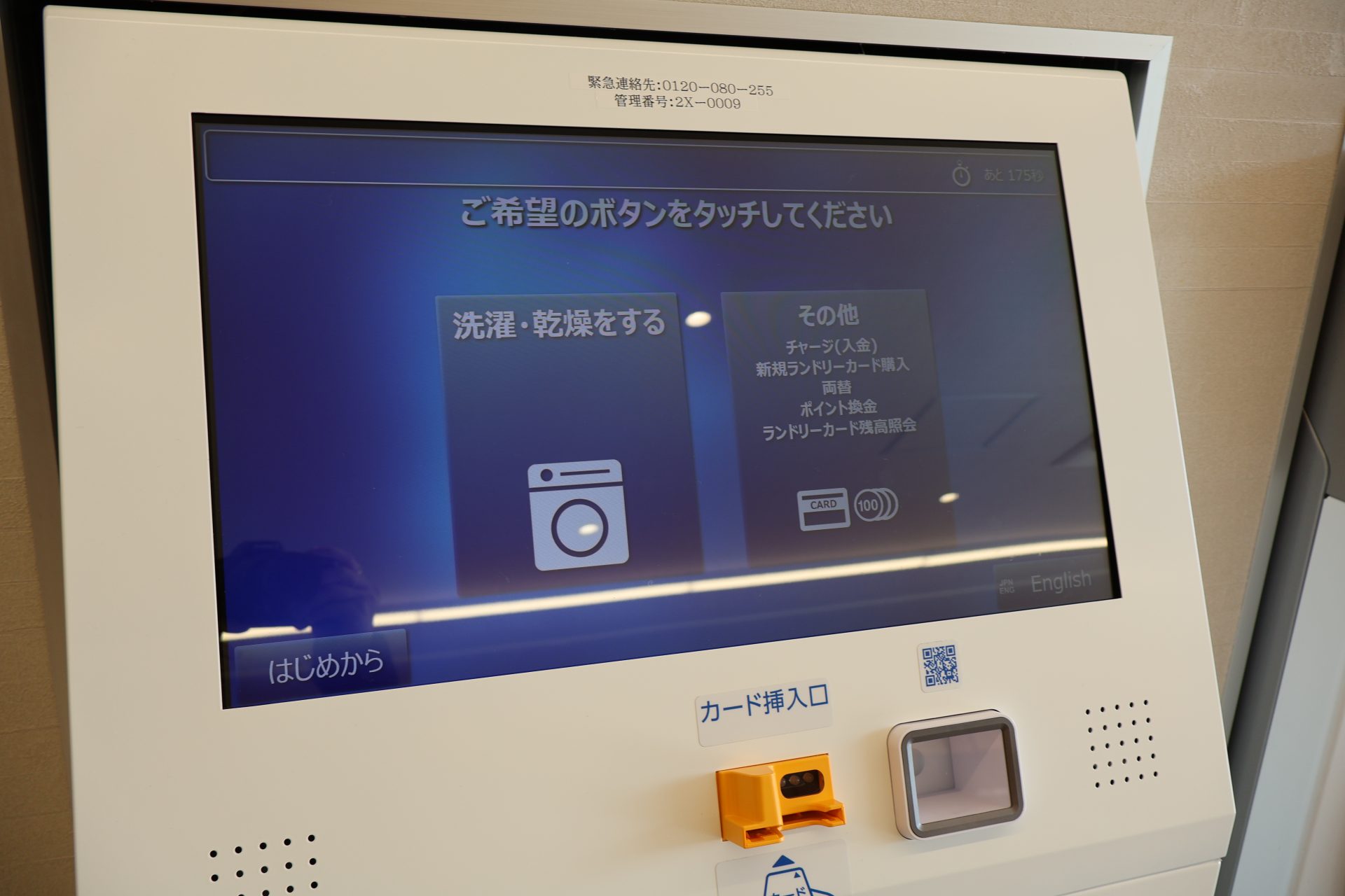 「コイン」ランドリーといっても、もうこの時代、キャッシュレス対応してくれています。ありがたいですね。該当の機械に洗濯物を入れて、こちらの精算機で、「洗濯・乾燥コース」を選び、支払うだけで洗濯がスタートしました。