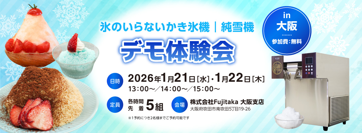 純雪機のデモ体験会1月21日(水)、22日(木)に株式会社Fujitaka大阪支店で実施いたします。