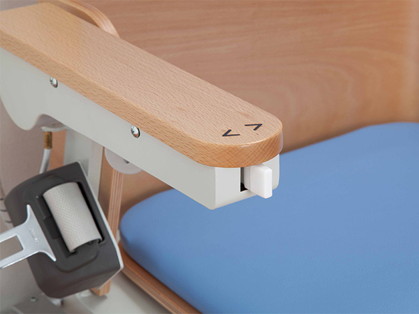 ひじ掛けと足のせ台が連動するので、立ったままの姿勢で足のせ台を折りたたんだり、下ろしたりできます。