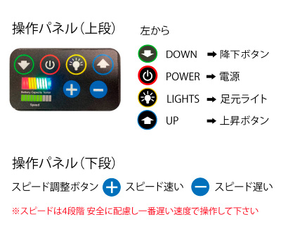 階段の勾配に添わして、手元のボタンで、上がる・下がる操作をしてください。