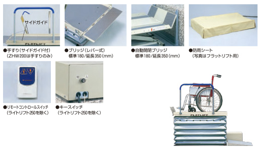 ■オプションにて「手すり(サイドガイド付)」「ブリッジ」「延長ブリッジ」「自動開閉ブリッジ」「リモートコントロールスイッチ」「防雨シート」「キースイッチ」もご用意いたします。