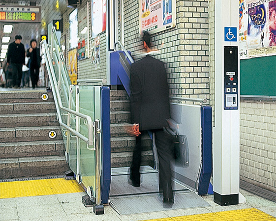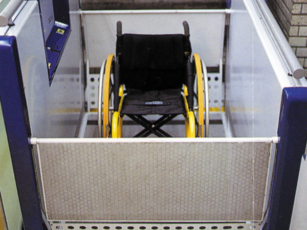●仕切り/手すり昇降機に手や物をはさむのを防ぐ仕切りと歩行者に便利な手すり付き。