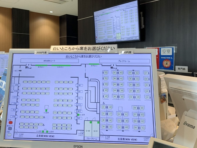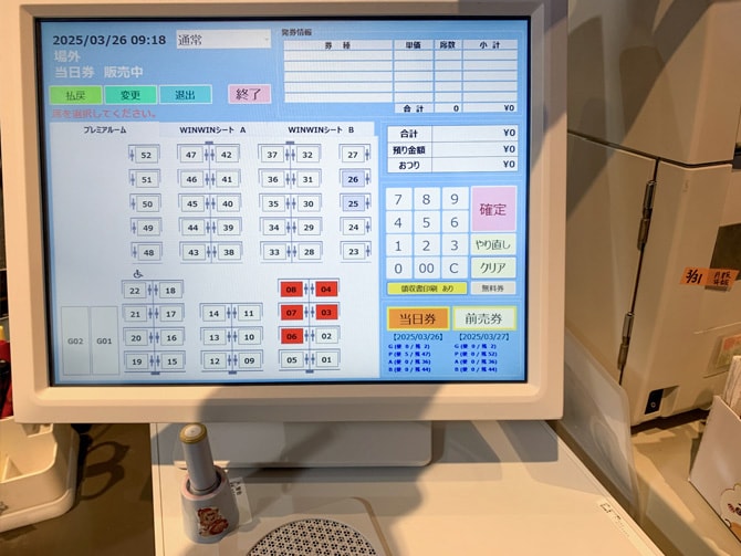 入場料の100円を投入するか、再入場券をかざすことで入場可能。さらに有料観覧席の窓口機では、お客様が選んだ席が反映されるようになっています。