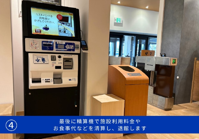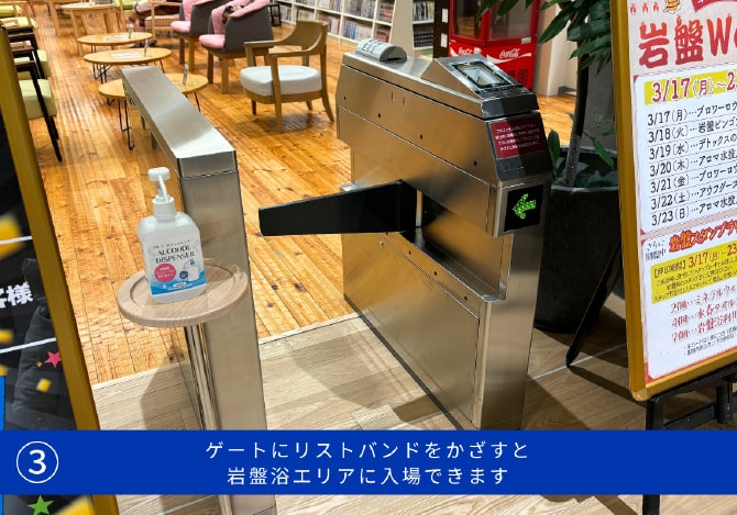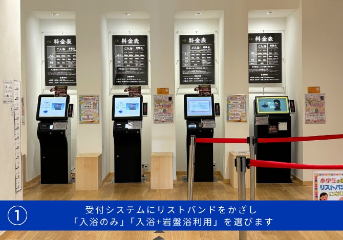 岩盤浴利用の有無は、施設入口の受付システムに靴箱のカギにつけているリストバンド(バーコード)をかざし初めにお選びいただきます(岩盤浴は入浴と別料金)。岩盤浴利用者は、岩盤浴エリアの入口にあるゲートにリストバンドをかざすことで、入場することができます。