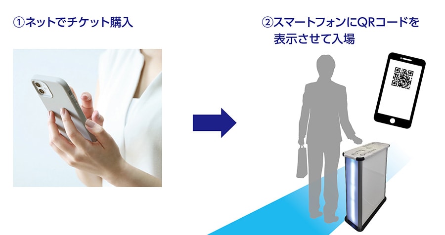 一つ目はオンライン上でチケットを購入し、スマートフォン上にバーコードを表示させ、ゲートで認証し通過するシステムです。