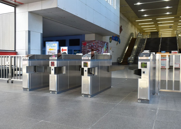 スタイリッシュなデザインのフラッパーゲート。 両サイドにフラップを備えた筐体を用い、省スペースで複数通路の設置が可 能です。レジャー施設やアミューズメント施設に多数の導入実績があります。 ラッピング加工などで施設の雰囲気に合わせることも可能です。