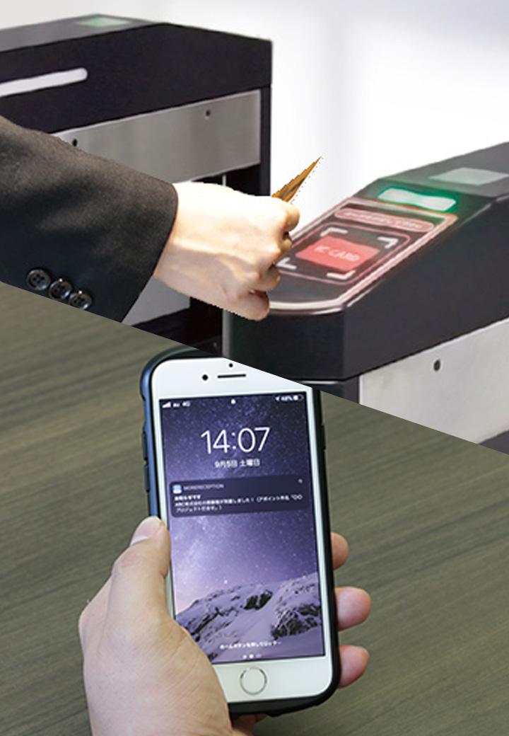 02.受付 お客様がQRコードを受付端末にかざし、入館証を受け取る。 ※入館証はICカード、チケットからお選びいただけます。